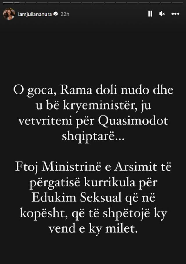 “O goca, Rama doli nudo dhe u bë kryeministër, ju vetëvriteni për Quasimodot shqiptarë. Ftoj Ministrinë e Arsimit të përgatisë kurrikula për edukimin seksual që në kopsht, që të shpëtojë ku vend e ky milet”, shkruan Xhuli.
