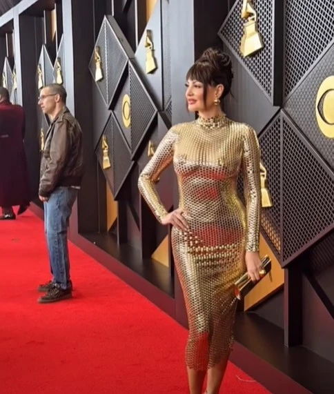 Këngëtarja ka zgjedhur një fustan me ngjyrë ari me efekt “liquid gold”, i cili reflekton dritën në çdo lëvizje, duke e bërë atë të jetë në qendrën e vëmendjes në tapetin e kuq.