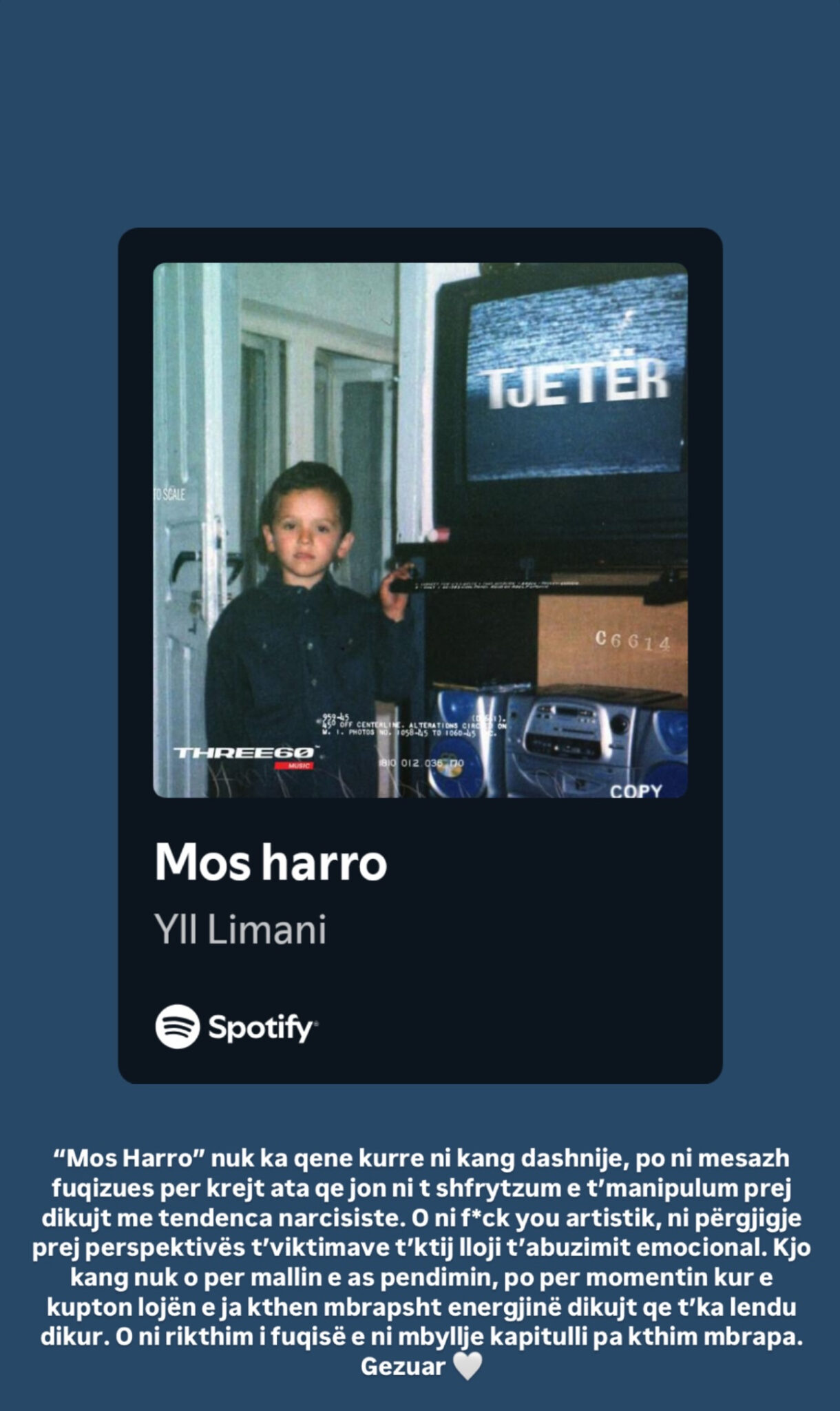 “Mos Harro” nuk ka qene kurre ni kang dashnije, po ni mesazh fuqizues per krejt ata qe jon ni t shfrytzum e t’manipulum prej dikujt me tendenca narcisiste. O ni f*ck you artistik, ni pergjigje prej perspektives t’viktimave t’ktij lloji t’abuzimit emocional. Kjo kang nuk o per mallin e as pendimin, po per momentin kur e kupton lojën e ja then mbrapsht energjine dikujt qe t’ka lendu dikur. O ni rikthim i fuqise e ni mbyllje kapitulli pa kthim mbrapa.