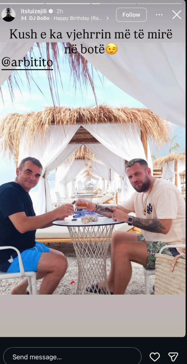 Luizi e ka shoqëruar foton me mbishkrimin krenar: “Kush e ka vjehrrin më të mirë në botë ???? @arbitito”, duke etiketuar babanë e partneres së tij.