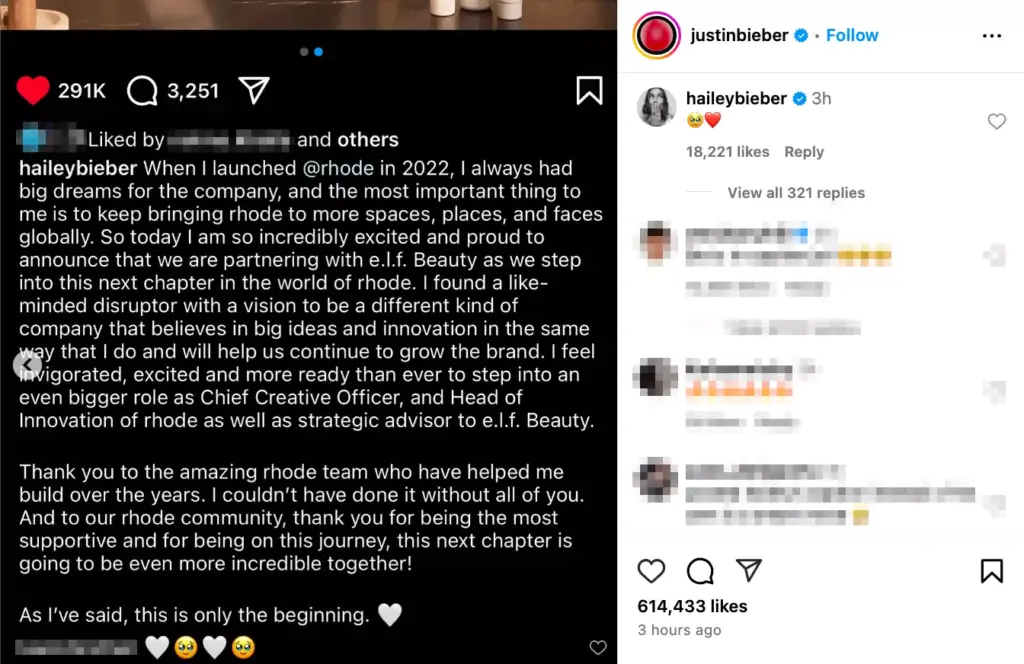 Pastaj, bashkëshorti i saj, Justin Bieber, bëri një fotografi të ekranit të njoftimit të saj dhe e shtoi atë në një karusel në Instagram. Ai gjithashtu përfshiu një pamje të mbishkrimit të saj në Instagram, pa shkruar asgjë tjetër. Komenti i vetëm që shkroi Hailey ishte një emoji në formë zemre.