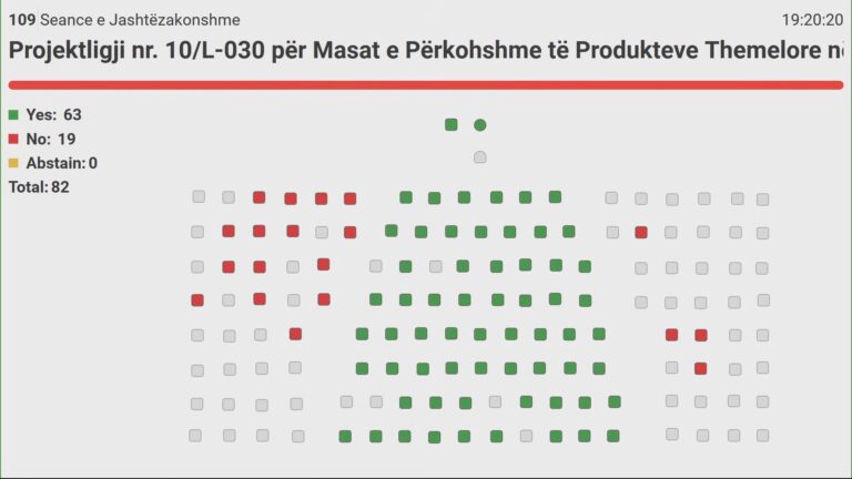 Me 63 vota pro, 19 kundër dhe asnjë abstenim, Kuvendi miratoi në parim Projektligjin për Masat e Përkohshme të Produkteve Themelore në Raste të Veçanta të Destabilizimit në Tregut, në seancën e jashtëzakonshme të mbajtur të premten pasdite.