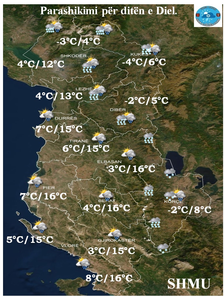 Në zonën e verilindje në lartësitë mbi 600-700 do ketë reshje dëbore me intensitet të ulët dhe mesatar. Në zonën e juglindjes në lartësitë mbi 700-800 metër reshje dëbore me intensitet të ulët dhe në lartësitë mbi 1000 metër intensitet deri mesatar.