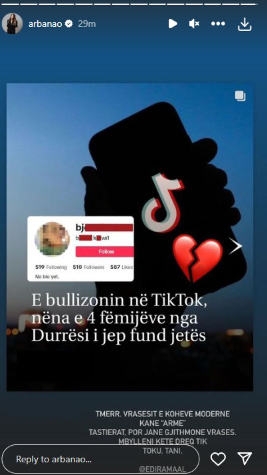 I menjëherëshëm ka qenë edhe reagimi publik pas ngjarjes së rëndë. Moderatorja Arbana Omani i ka bërë thirrje publike Edi Ramës që të mbyllë platformën e Tik Tok.