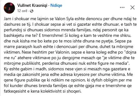 Përmes një postimi në Facebook, Krasniqi ka shprehur tronditjen e tij duke thënë se është i shokuar, veçanërisht si dikush që vetë ka qenë viktimë e dhunës.