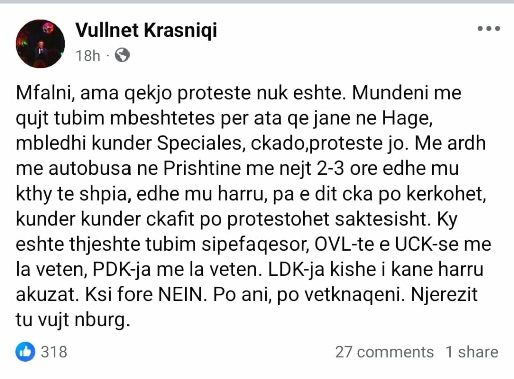 Në statusin e tij, Krasniqi tha se kjo “nuk është protestë” por një “tubim sipërfaqësor”, duke theksuar se pjesëmarrësit erdhën me autobusë, qëndruan 2-3 orë dhe u kthyen në shtëpi “pa e ditur saktë për çfarë po protestonin”. Ai akuzoi organizatorët për mungesë qëllimi dhe uniteti, duke përmendur OVL-në e UÇK-së dhe partitë politike si të fokusuara vetëm tek vetja.