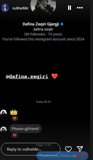 Instagrami zyrtarë i Vullnetit, ka publikuar bisedën me këngëtaren Dafina Zeqiri.