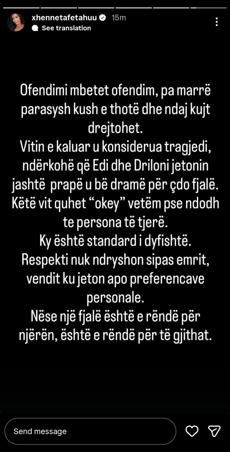 “Ofendimi mbetet ofendim, pa marrë parasysh kush e thotë. Vitin e kaluar u konsiderua tragjedi, ndërkohë që Edi dhe Driloni jetonin jashtë prapë u bë dramë për çdo fjalë,” shkruan Xheneta e revoltuar.