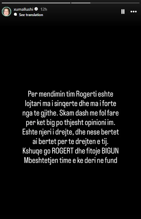 “Sipas mendimit tim, Rogerti është lojtari më i sinqertë dhe më i fortë nga të gjithë”, ka shkruar ai. Më tej, ish-banori ka shtuar se e sheh atë si një person të drejtë, duke theksuar se reagimet e tij të forta vijnë si pasojë e mbrojtjes së së drejtës së vet.
