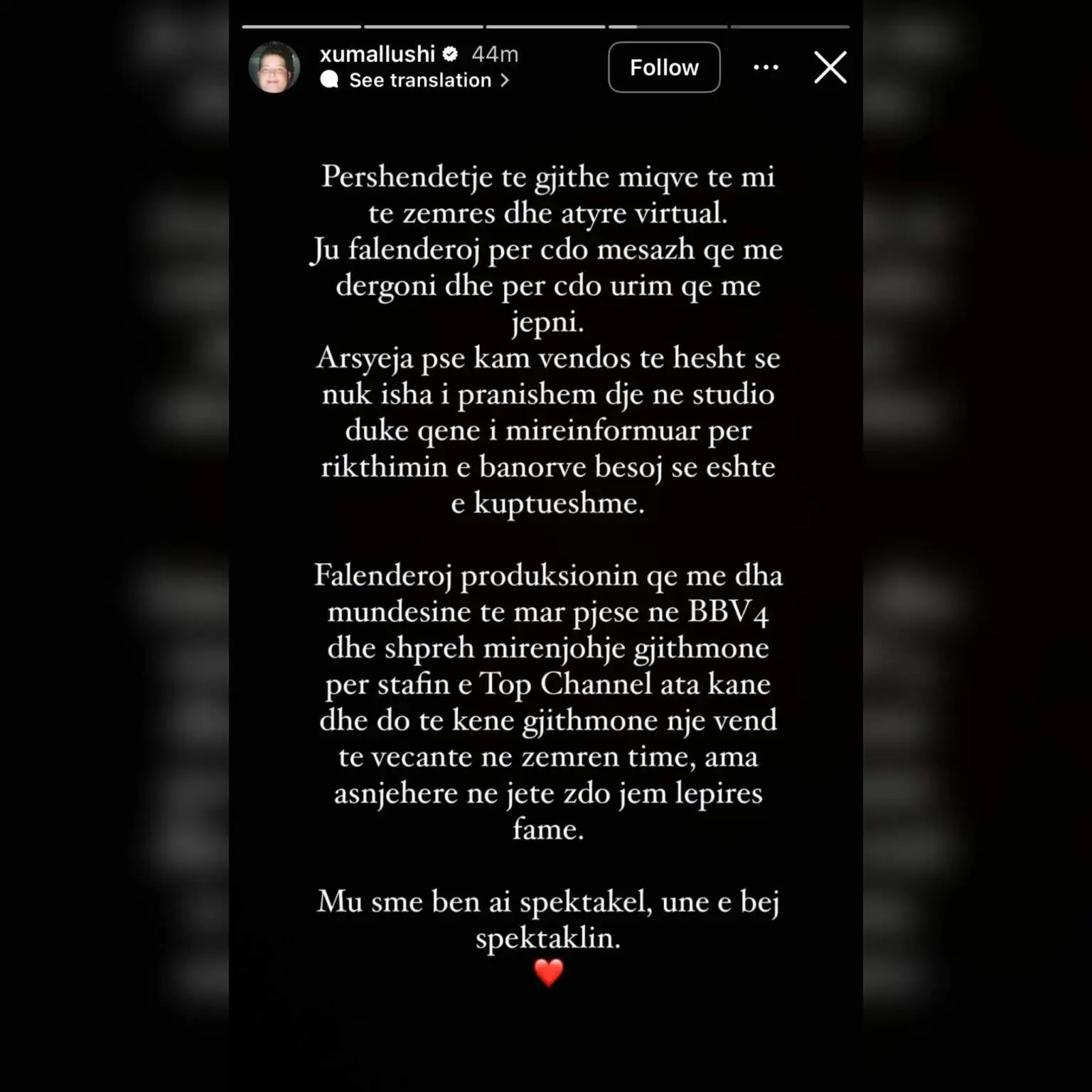 “Mu s’më bën ai spektakël, unë e bëj spektaklin,” shkroi ai në fund të reagimit të tij, duke lënë të kuptohet se ka ende shumë për të thënë.