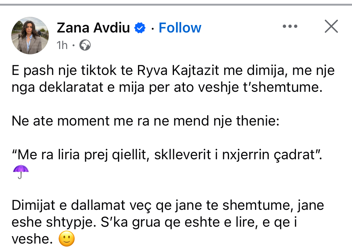 Zana Avdiu ka reaguar sërish lidhur me debatin për dimijat, pasi pa një video të Ryva Kajtazit në TikTok të veshur me këtë veshje tradicionale.