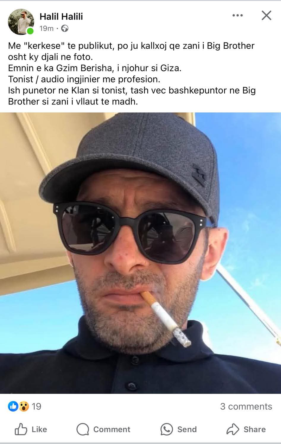 Halil Halili ka publikuar imazhin e vëllait të madh në llogarinë e tij duke u shprehur “Më kërkesë të publikut, po ju kallëzoj që zani i Big Brother osht ky djali në foto, emrin e ka Gzim Berisha, i njohur si Giza. Tonist/audio inxhinier më profesion. Ish punëtor në Klan si tonist, tash veç bashkëpunëtor ne Big Brother si zani i vëllait te madh”.