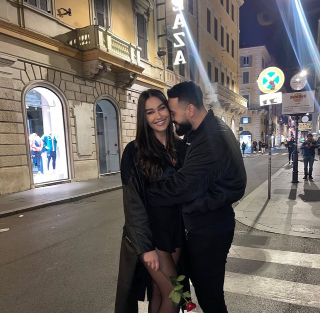 Fotoja romantike, e realizuar në mes të qytetit nën dritat e natës, i tregon të dy shumë të afërt dhe të buzëqeshur, duke reflektuar një harmoni të dukshme mes tyre.
