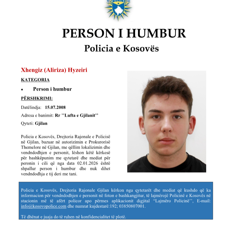 Policia e Kosovës, Drejtoria Rajonale e Policisë në Gjilan, bazuar në autorizimin e Prokurorisë Themelore në Gjilan, me qëllim lokalizimin dhe vendndodhjen e personit, lëshon këtë kërkesë për bashkëpunim me qytetarë dhe mediat për peronin i cili që nga data 02.01.2026 është shpallur person i humbur dhe nuk dihet vendndodhja e tij deri me tani.