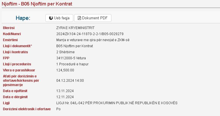 Zyra e Kryeministrit të Kosovës, përmes prokurimit publik po kërkon vetura me qera. Vlera e përcaktuar nga prokurimi i zyrës së Kryeministrit është 125 mijë e 500 euro.